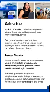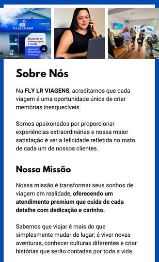 Na Fly LR Viagens, transformamos seus sonhos em destinos. Somos uma agência especializada em pacotes de viagens nacionais e internacionais, com atendimento personalizado e as melhores condições do mercado. Aqui, você encontra experiências únicas, suporte completo e confiança do planejamento ao desembarque. Viajar com a Fly LR é mais fácil, seguro e inesquecível.